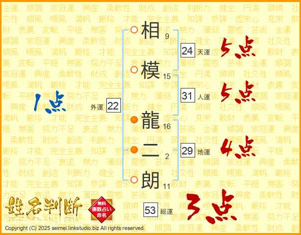 相(9画)模(15画) 龍(16画)二(2画)朗(11画)