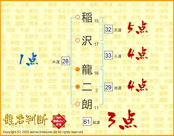 稲(15画)沢(17画) 龍(16画)二(2画)朗(11画)