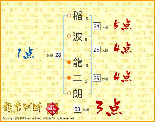 稲(15画)波(9画) 龍(16画)二(2画)朗(11画)