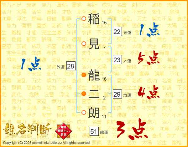 稲(15画)見(7画) 龍(16画)二(2画)朗(11画)