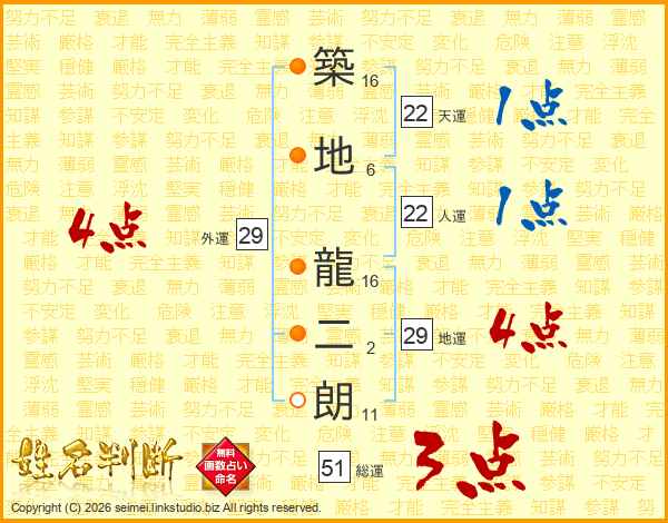 築(16画)地(6画) 龍(16画)二(2画)朗(11画)