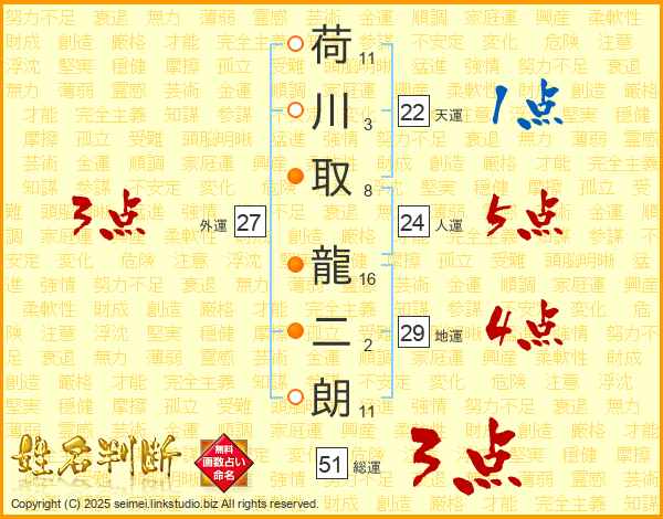 荷(11画)川(3画)取(8画) 龍(16画)二(2画)朗(11画)