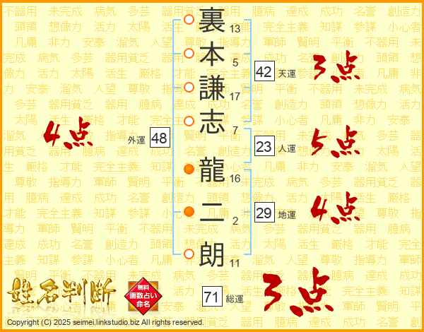 裏本謙志龍二朗さんの人運は23画の5点!