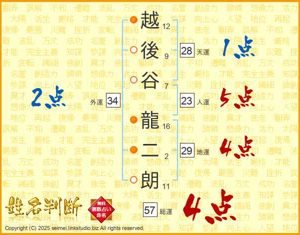 越(12画)後(9画)谷(7画) 龍(16画)二(2画)朗(11画)