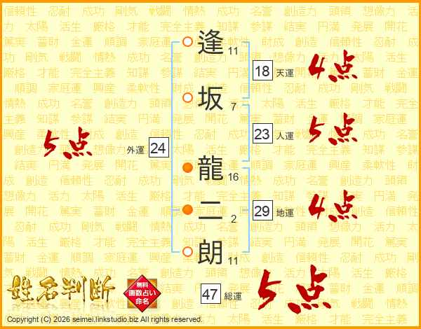 逢坂龍二朗さんの総運は47画の5点!