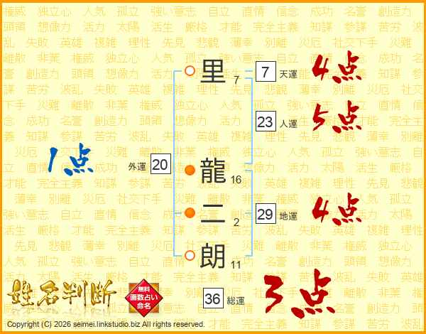 生活面を象徴する運勢です。外部から受ける影響力を表し、結婚運、家庭運や職場、環境への順応性を表します。総運から人運を引いた画数。姓や名が1文字の場合を除く。