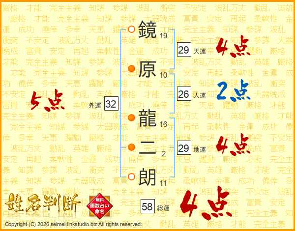 鏡原龍二朗さんの総運は58画の4点!