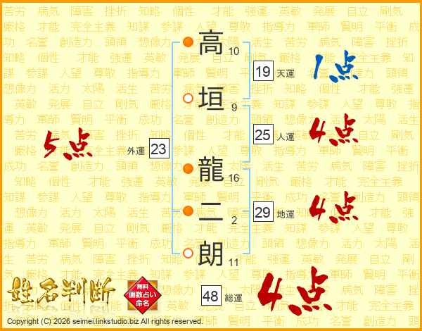 高(10画)垣(9画) 龍(16画)二(2画)朗(11画)