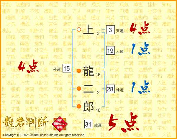 上龍二郎さんの総運は31画の5点!