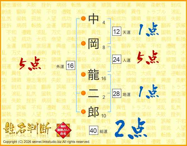 中(4画)岡(8画) 龍(16画)二(2画)郎(10画)