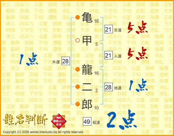 亀(16画)甲(5画) 龍(16画)二(2画)郎(10画)