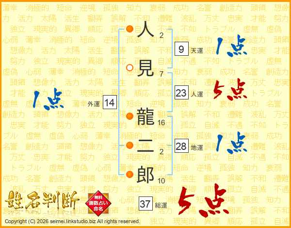 人(2画)見(7画) 龍(16画)二(2画)郎(10画)