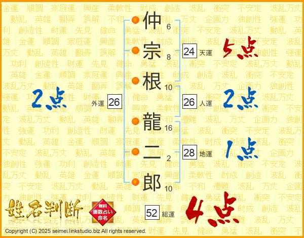 仲宗根龍二郎さんの総運は52画の4点!