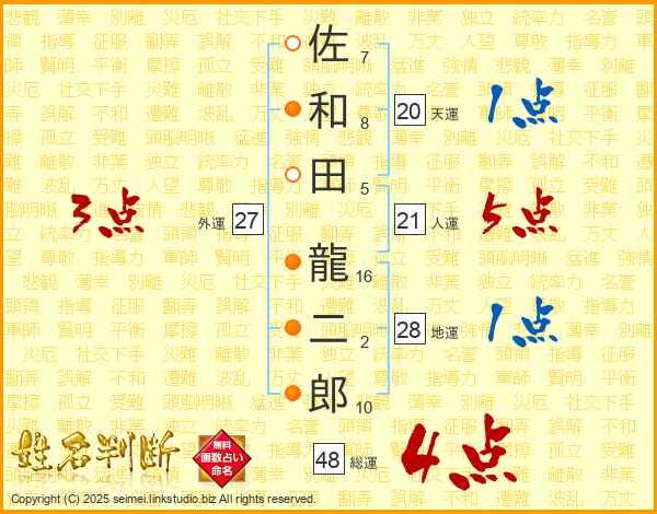 佐(7画)和(8画)田(5画) 龍(16画)二(2画)郎(10画)