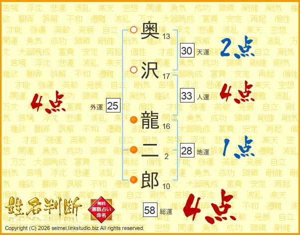 奥沢龍二郎さんの総運は58画の4点!