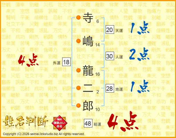寺(6画)嶋(14画) 龍(16画)二(2画)郎(10画)
