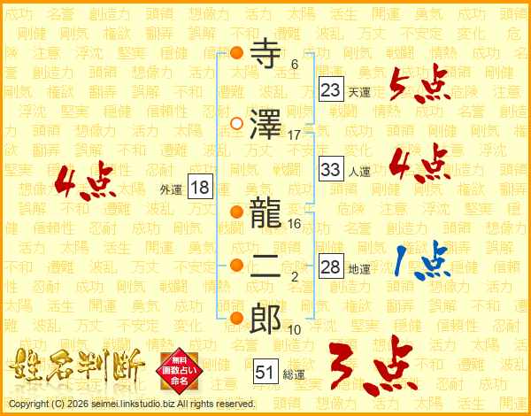 寺(6画)澤(17画) 龍(16画)二(2画)郎(10画)