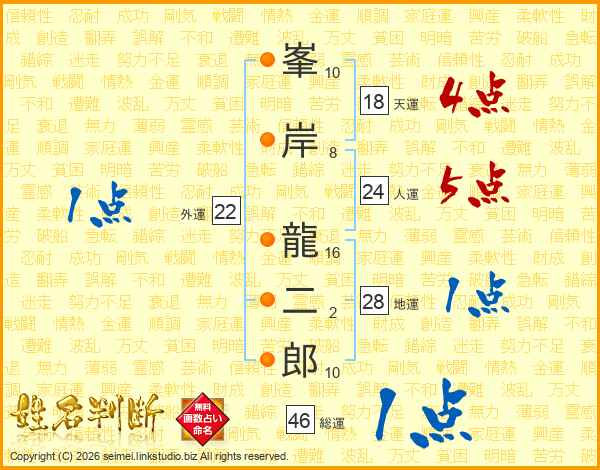峯(10画)岸(8画) 龍(16画)二(2画)郎(10画)