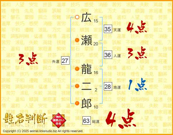 広瀬龍二郎さんの総運は63画の4点!