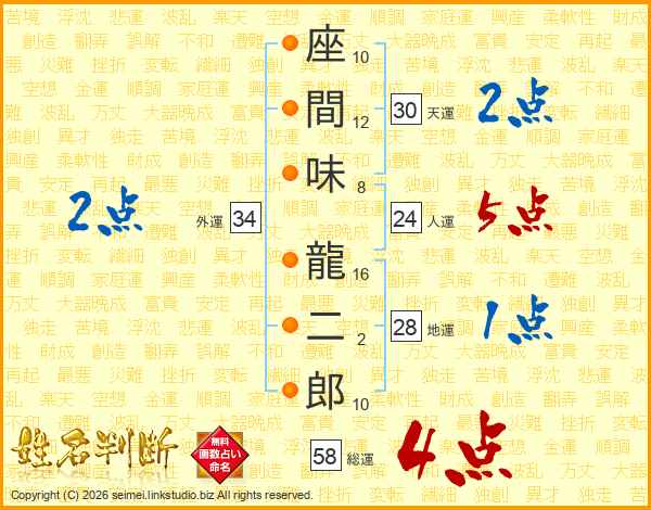 座(10画)間(12画)味(8画) 龍(16画)二(2画)郎(10画)