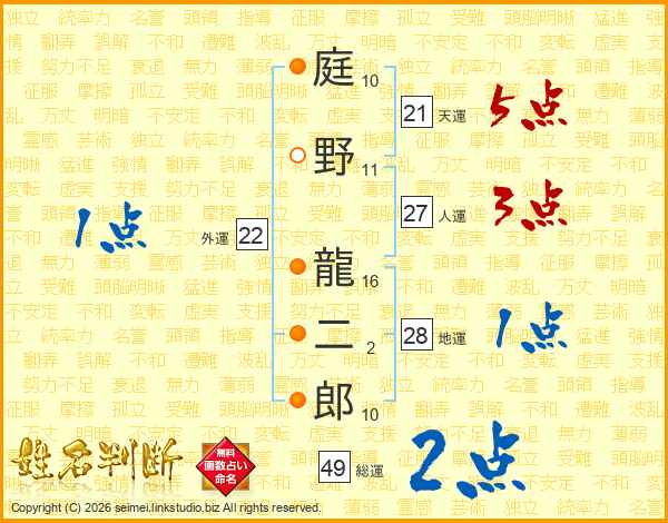 庭(10画)野(11画) 龍(16画)二(2画)郎(10画)