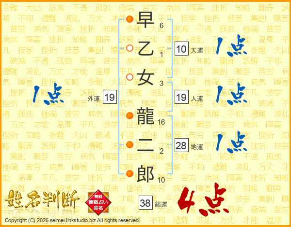 早(6画)乙(1画)女(3画) 龍(16画)二(2画)郎(10画)