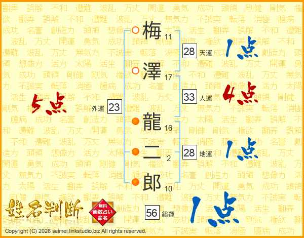 梅(11画)澤(17画) 龍(16画)二(2画)郎(10画)