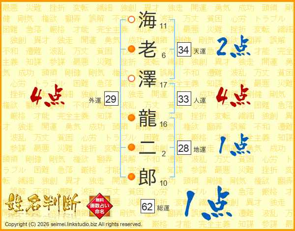 海(11画)老(6画)澤(17画) 龍(16画)二(2画)郎(10画)