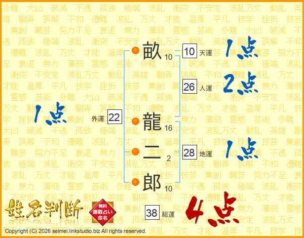 畝龍二郎さんの総運は38画の4点!