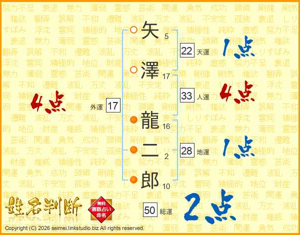 矢(5画)澤(17画) 龍(16画)二(2画)郎(10画)