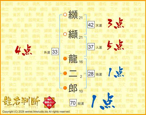纐纈龍二郎さんの人運は37画の5点!