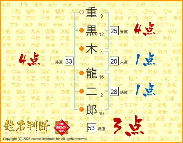 重(9画)黒(12画)木(4画) 龍(16画)二(2画)郎(10画)