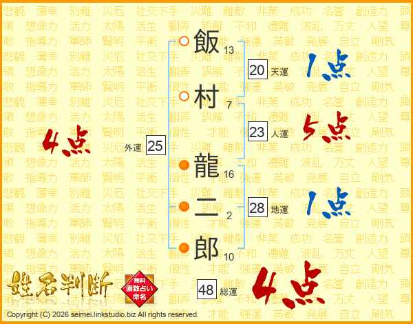 飯(13画)村(7画) 龍(16画)二(2画)郎(10画)