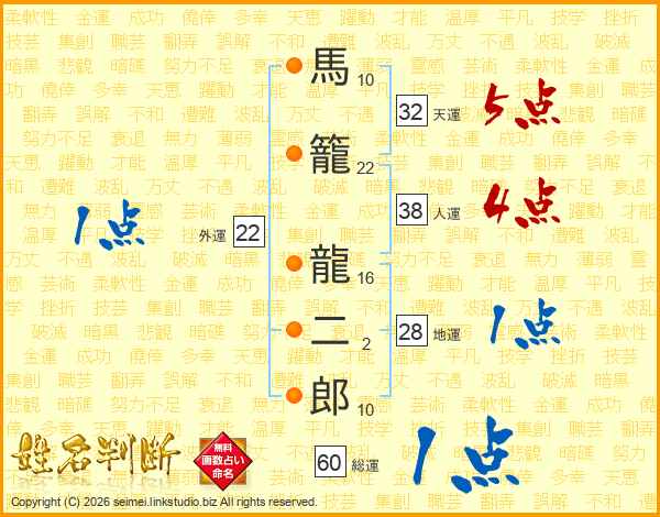 馬(10画)籠(22画) 龍(16画)二(2画)郎(10画)