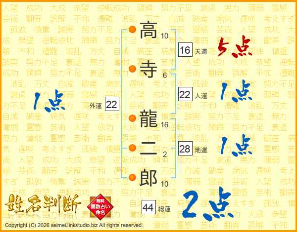 高寺龍二郎さんの総運は44画の2点!