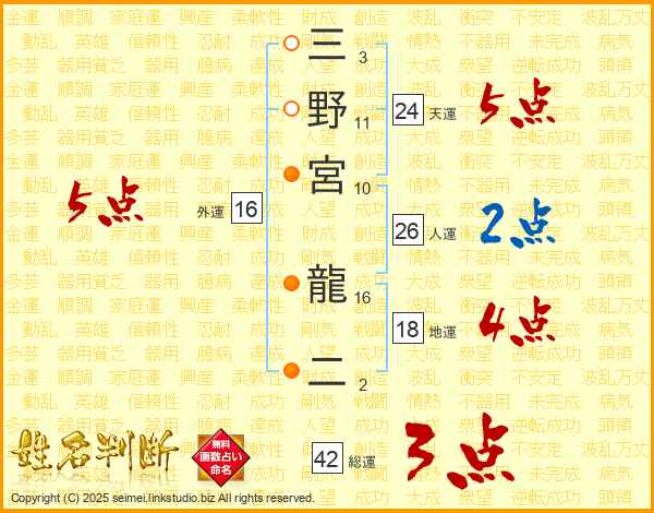 三(3画)野(11画)宮(10画) 龍(16画)二(2画)