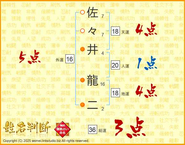佐(7画)々(7画)井(4画) 龍(16画)二(2画)