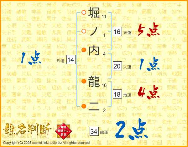 堀(11画)ノ(1画)内(4画) 龍(16画)二(2画)