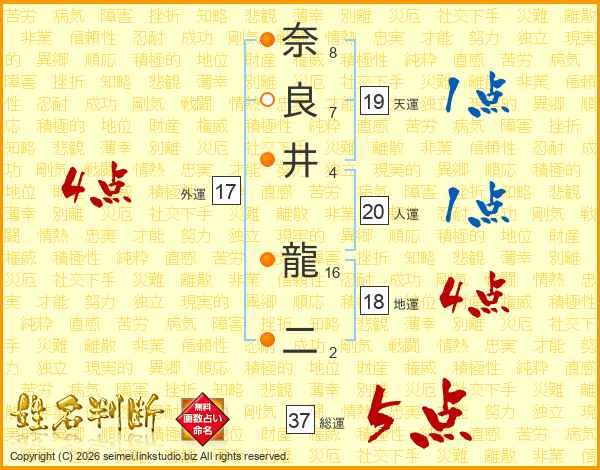 奈(8画)良(7画)井(4画) 龍(16画)二(2画)