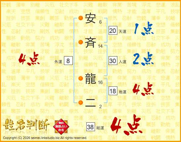 安斉龍二さんの総運は38画の4点!