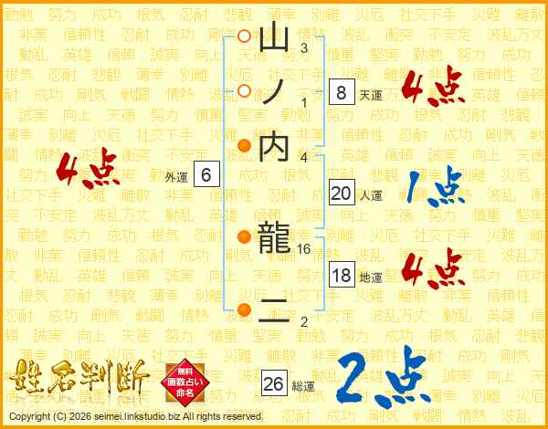 山(3画)ノ(1画)内(4画) 龍(16画)二(2画)