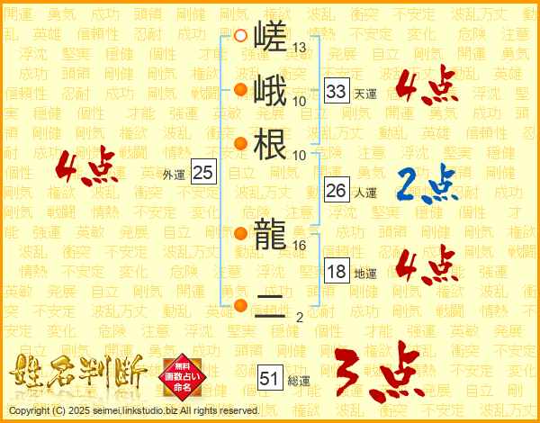 嵯(13画)峨(10画)根(10画) 龍(16画)二(2画)