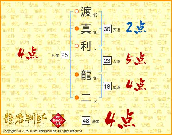 渡(13画)真(10画)利(7画) 龍(16画)二(2画)