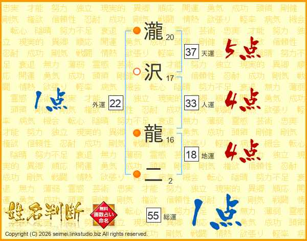 瀧(20画)沢(17画) 龍(16画)二(2画)
