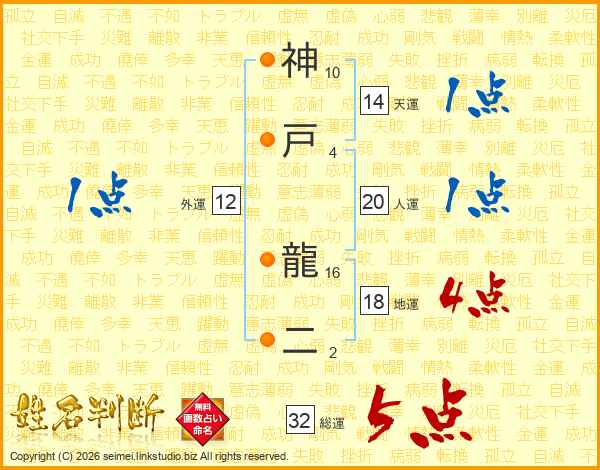 生活面を象徴する運勢です。外部から受ける影響力を表し、結婚運、家庭運や職場、環境への順応性を表します。総運から人運を引いた画数。姓や名が1文字の場合を除く。