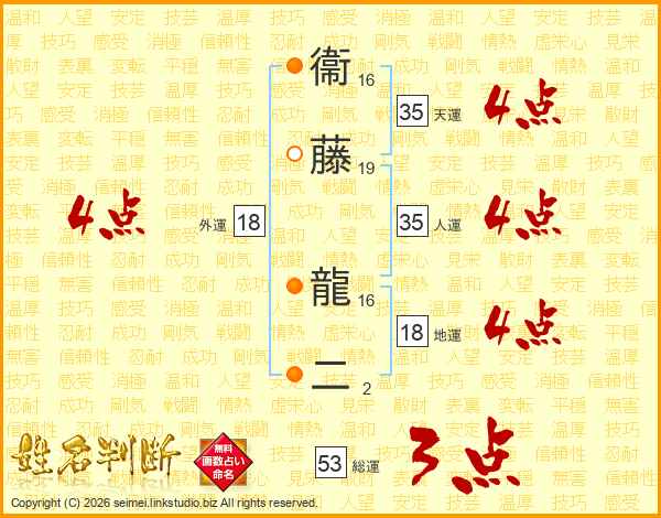 衞藤龍二さんの総運は53画の3点!