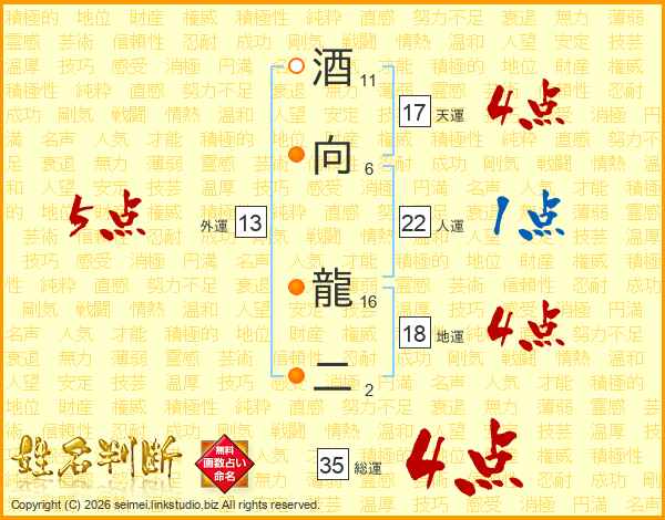 家系が持つ宿命的な運勢を表します。祖先から受け継いだ苗字ですので自分の力が及びません。家柄を象徴します。苗字の合計画数。