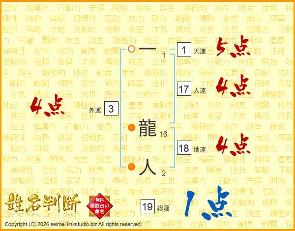 生活面を象徴する運勢です。外部から受ける影響力を表し、結婚運、家庭運や職場、環境への順応性を表します。総運から人運を引いた画数。姓や名が1文字の場合を除く。