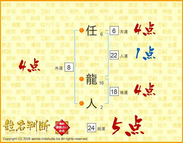 任龍人さんの総運は24画の5点!