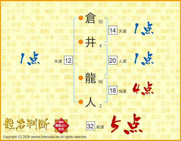 生活面を象徴する運勢です。外部から受ける影響力を表し、結婚運、家庭運や職場、環境への順応性を表します。総運から人運を引いた画数。姓や名が1文字の場合を除く。
